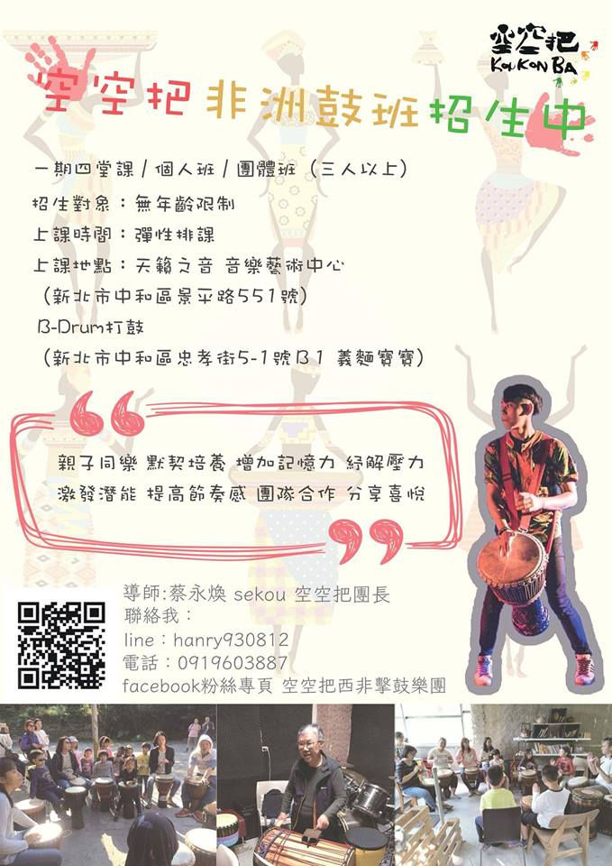 #非洲鼓教學 #空空把 #音樂 #打擊 ─────────────────── 分為個人班、團體班(3人以上)一期四堂課 招生對象:無年齡限制 上課時間:彈性排課 上課地點:天籟之音 音樂藝術中心、B-Drum打鼓 報名方式:私訊空空把粉絲專頁、電話0919603887 ─────────────────── 空空把更新囉~歡迎大家關注追蹤和訂閱🙏🏻 粉絲專頁👉🏻https://www.facebook.com/pg/konkonbataiwan/posts/?ref=page_internal Instagram👉🏻https://www.instagram.com/konkonbatw YouTube👉🏻https://www.youtube.com/channel/UCkBf-nFt2bY9Honcy8DA-pA